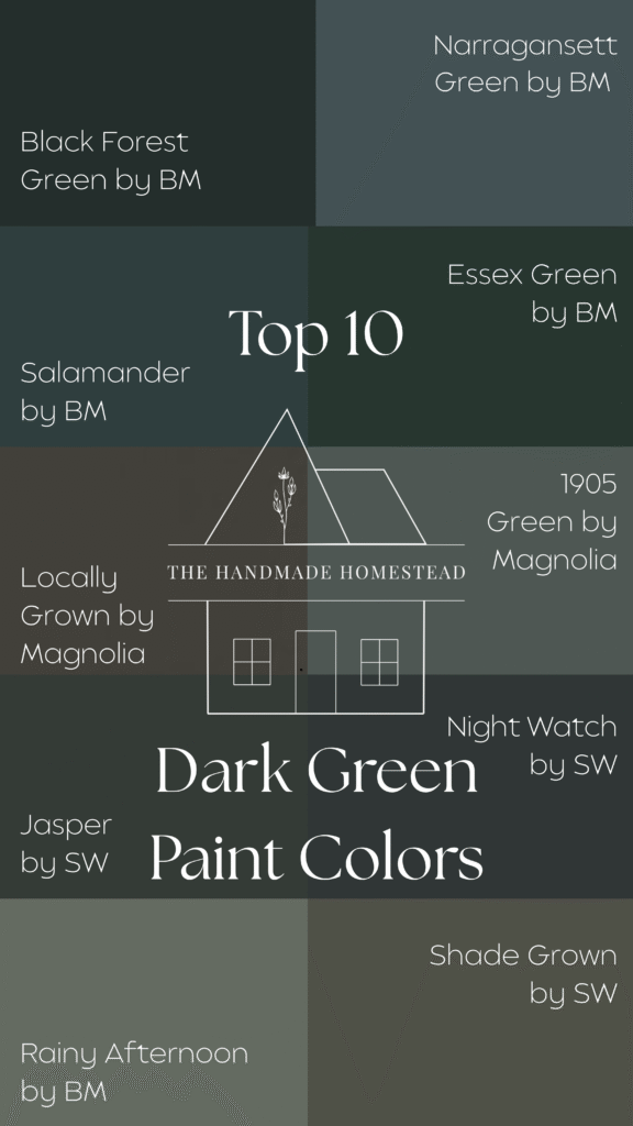 These are my top 10 dark green paint colors that I personally chose between when picking a color for our guest bath and our master bedroom. I think all of these would look beautiful with dark Moody wallpaper in a bathroom or to color drench a bedroom – like what I am using them for. I also think they would be a fun island color if you like the two-tone kitchen cabinet style. If you have the right space, I think any of these would be awesome cabinet colors. Overall – they are my favorite pretty dark greens!